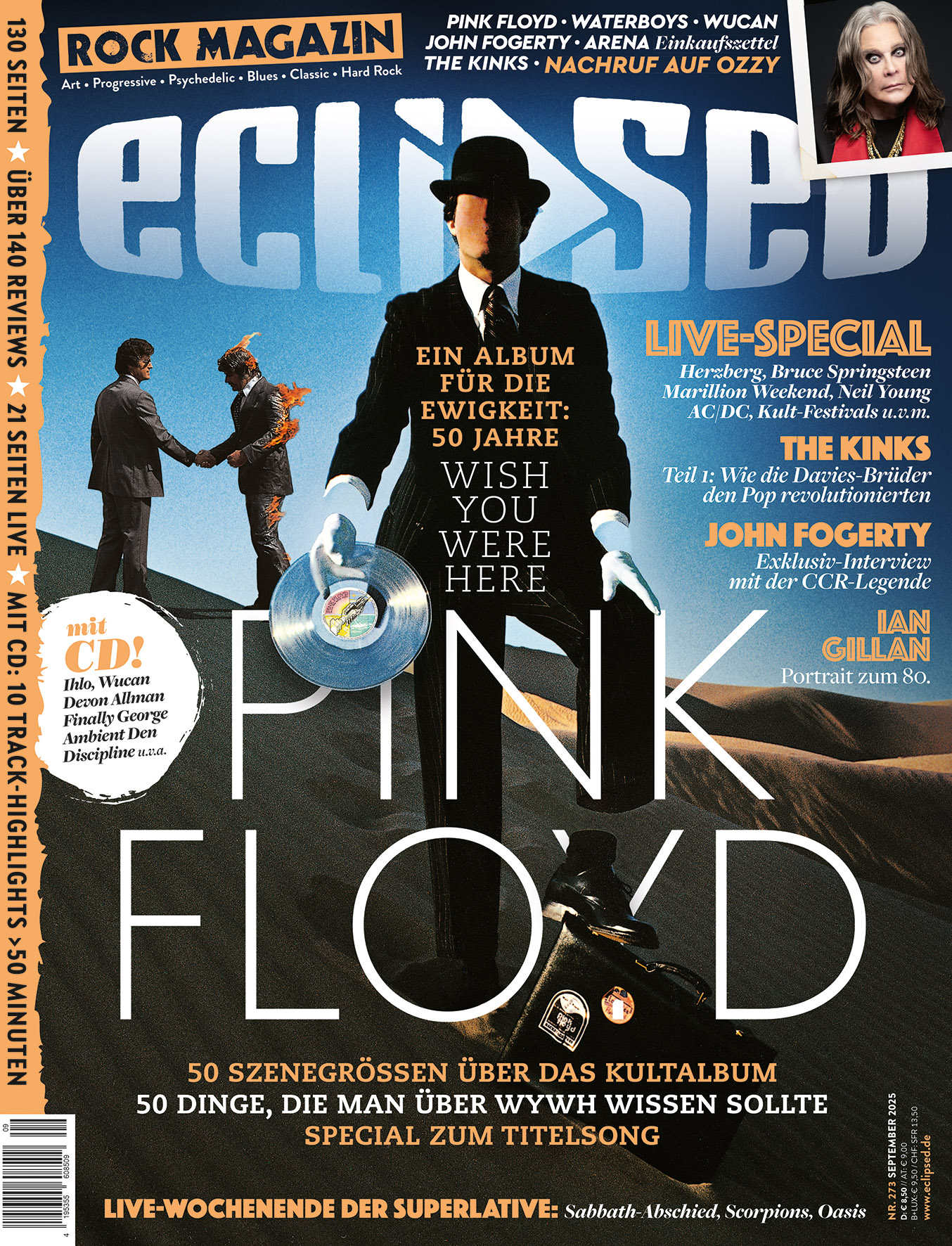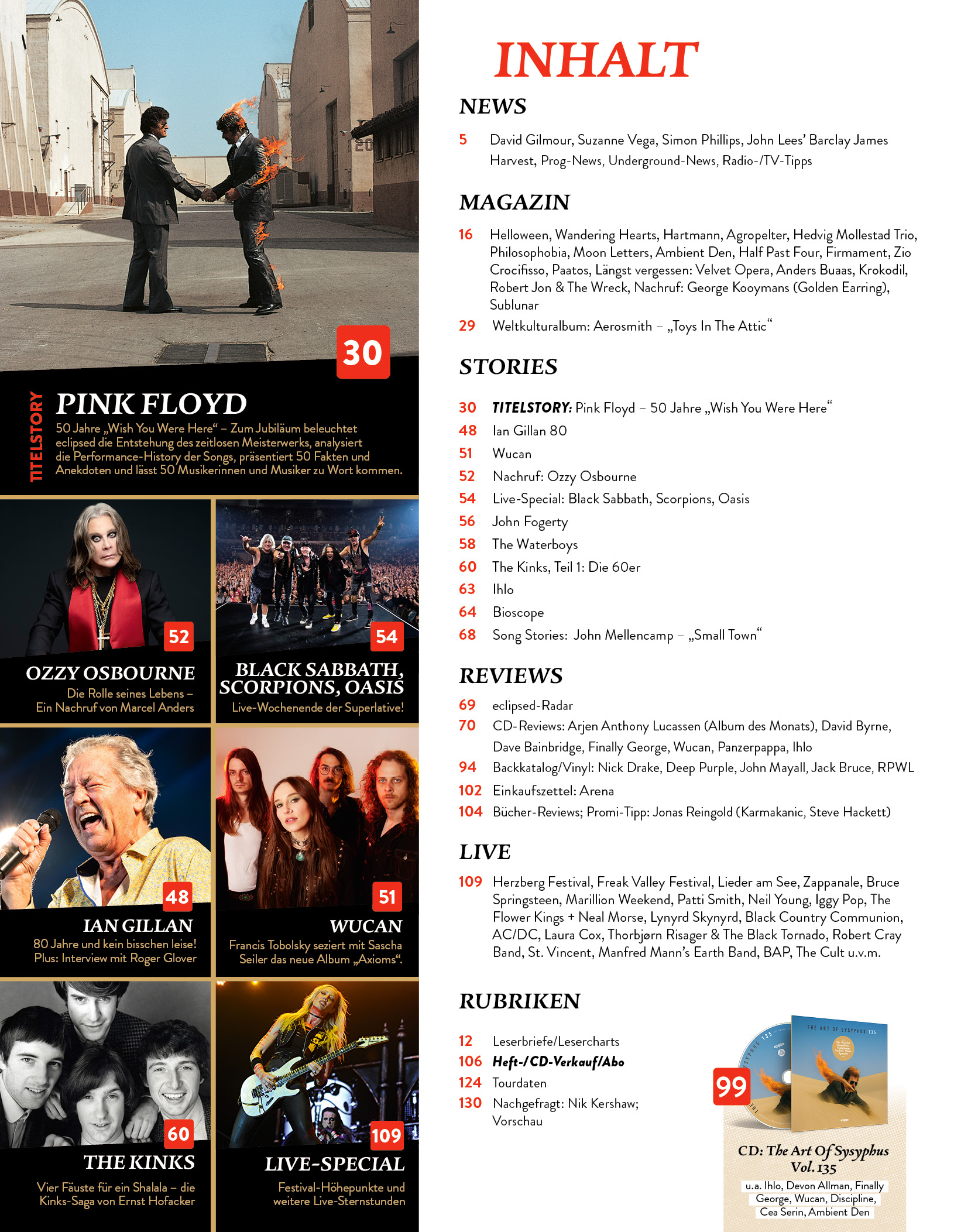 Hauptstories: Titelstory: Pink Floyd – 50 Jahre „Wish You Were Here“, Ian Gillan 80, Wucan, Nachruf: Ozzy Osbourne, Live-Special: Black Sabbath/Scorpions/Oasis, John Fogerty, The Waterboys, The Kinks, Teil 1: Die 60er, Ihlo, Bioscope