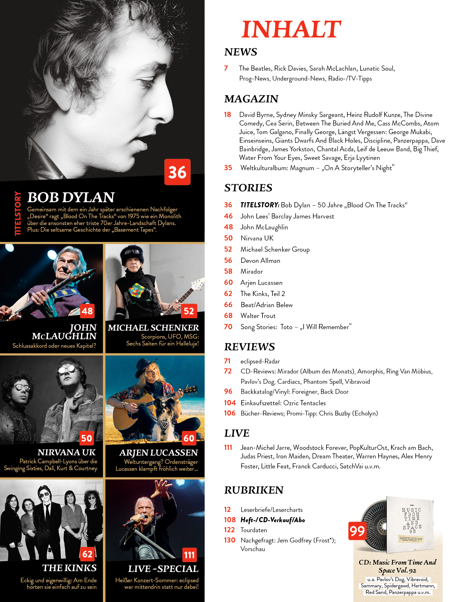 Hauptstories: Titelstory: Bob Dylan – 50 Jahre „Blood On The Tracks“, John Lees’ Barclay James Harvest, John McLaughlin, Nirvana UK, Michael Schenker Group, Devon Allman, Mirador, Arjen Lucassen, The Kinks, Teil 2, Beat/Adrian Belew, Walter Trout