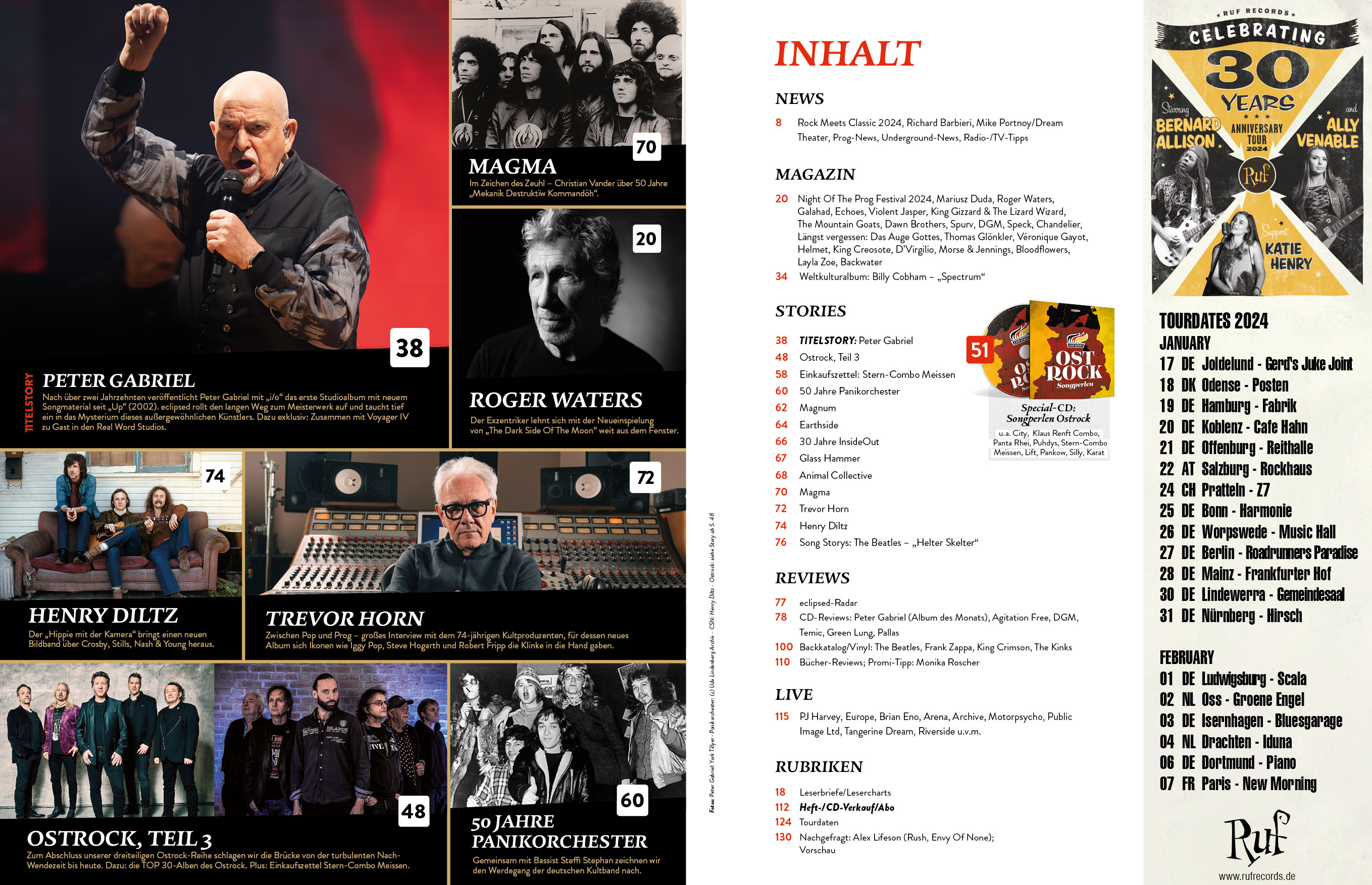 Hauptstories: Titelstory: Peter Gabriel, Ostrock, Teil 3, Einkaufszettel: Stern-Combo Meissen, 50 Jahre Panikorchester, Magnum, Earthside, 30 Jahre InsideOut, Glass Hammer, Animal Collective, Magma, Trevor Horn, Henry Diltz