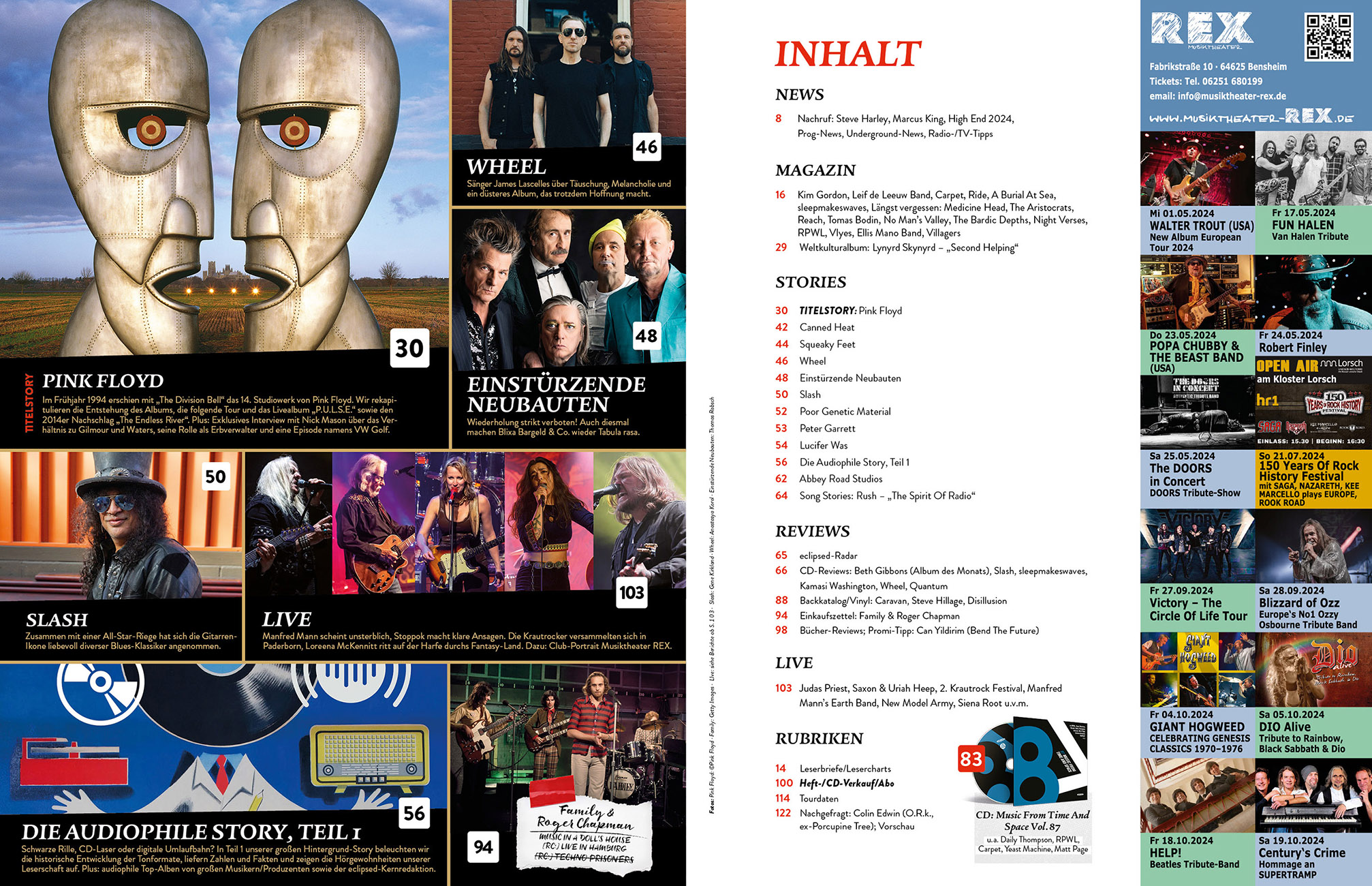 Hauptstories: Titelstory: Pink Floyd, Canned Heat, Squeaky Feet, Wheel, Einstürzende Neubauten, Slash, Poor Genetic Material, Peter Garrett, Lucifer Was, Die Audiophile Story, Teil 1, Abbey Road Studios